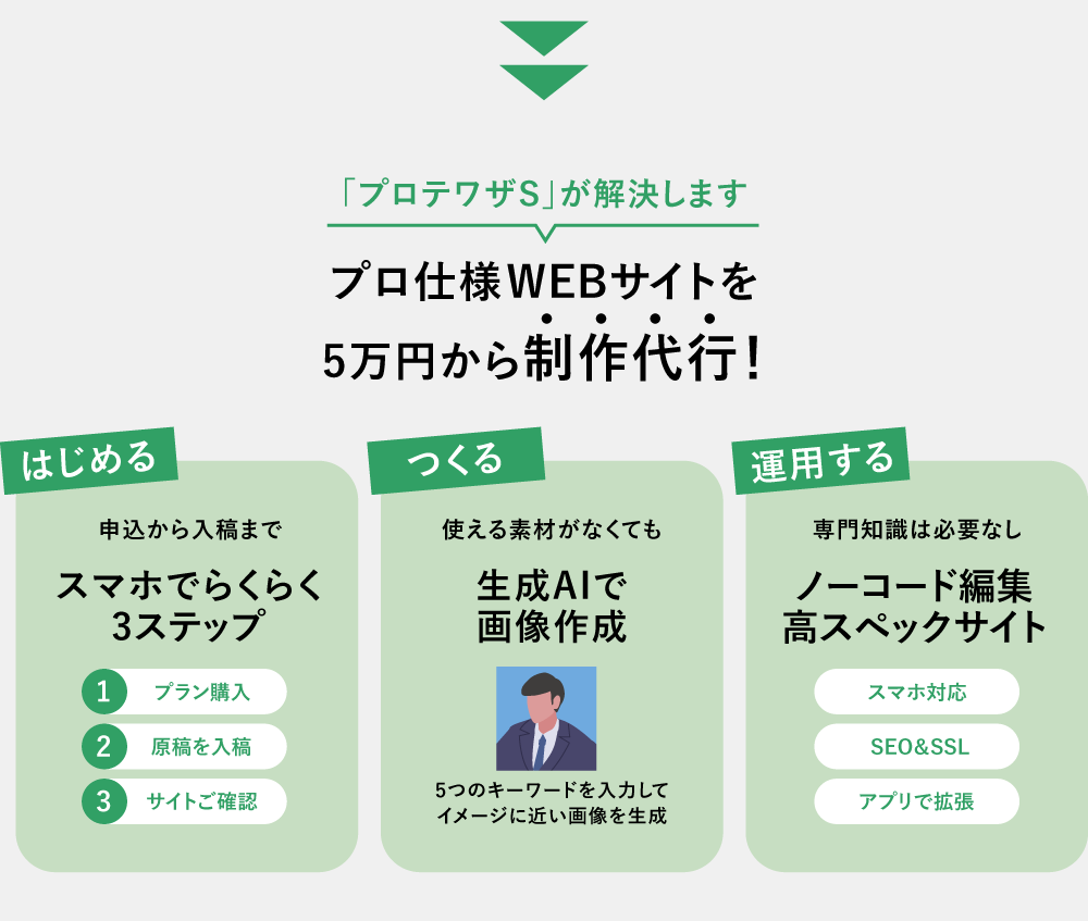 - ※5 生成AIで出力した画像は提示したものの中から選択いただきます。変更したい場合は、ホームページお引き渡し後にお客様自身で変更となりますのでご了承ください。